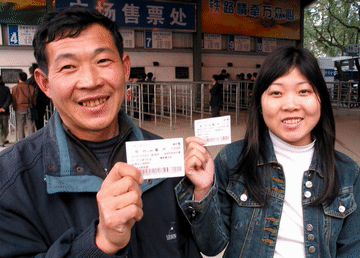 2003年1月20日,来自安徽的程勉珍父女一到福州火车站就买到了回家的火车票。新华社记者 丁海军 摄