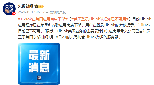 目前TikTok应用程序已在苹果和谷歌应用商店下架。用户在登录TikTok时会被提示,“TikTok目前已不可用。”据悉,TikTok美国业务的主要云计算供应商甲骨文公司已告知员工于美国东部时间1月18日21时关闭托管TikTok数据的服务器。