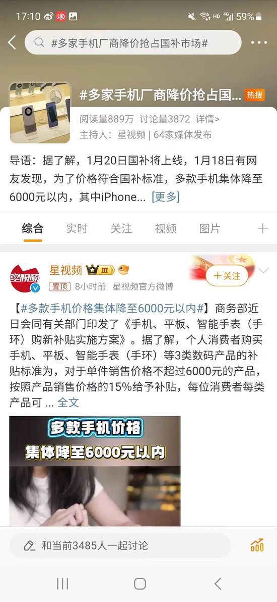 据报道,1月18日有网友发现,为了价格符合国补标准,多款手机集体降至6000元以内,其中iPhone16 Plus128G版本更是直降千元。