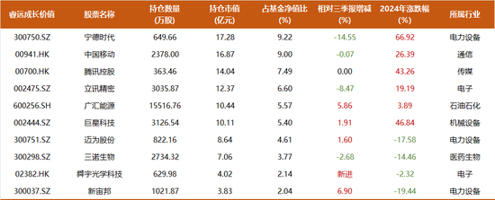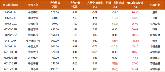 减持方面,饶刚对宁德时代减持了53.85%,腾讯和中移动的持仓也略有下滑。