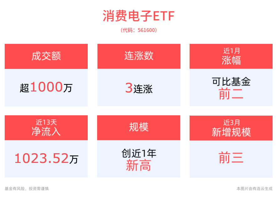 份额方面,消费电子ETF本月以来份额增长1300.00万份,实现显著增长,新增份额位居可比基金3/7。