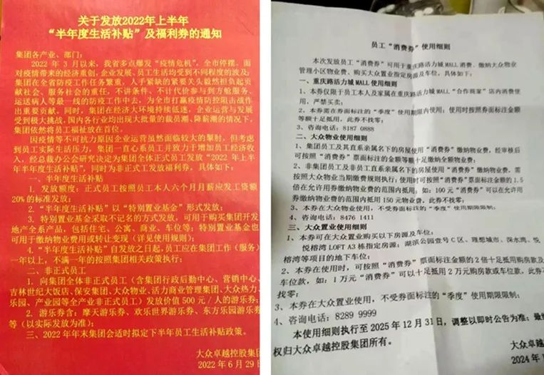 今年初,吉林长春大众卓越控股集团关联的多家公司员工表示,在等待去年工资发放时,等来的却是一沓沓数额不一的消费券。