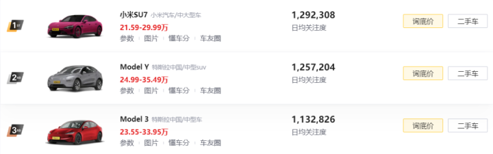 懂车帝数据显示,1月20日,用户关注排名前三的车型分别是小米SU7、Model Y、Model 3。