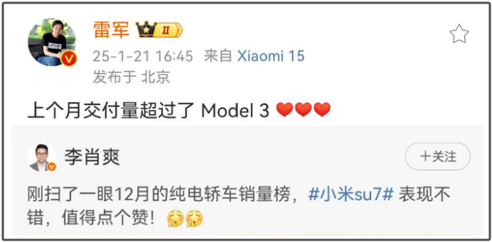 1月21日,小米创始人、董事长兼CEO雷军发布微博称,小米SU7去年12月的交付量超过了Model 3。