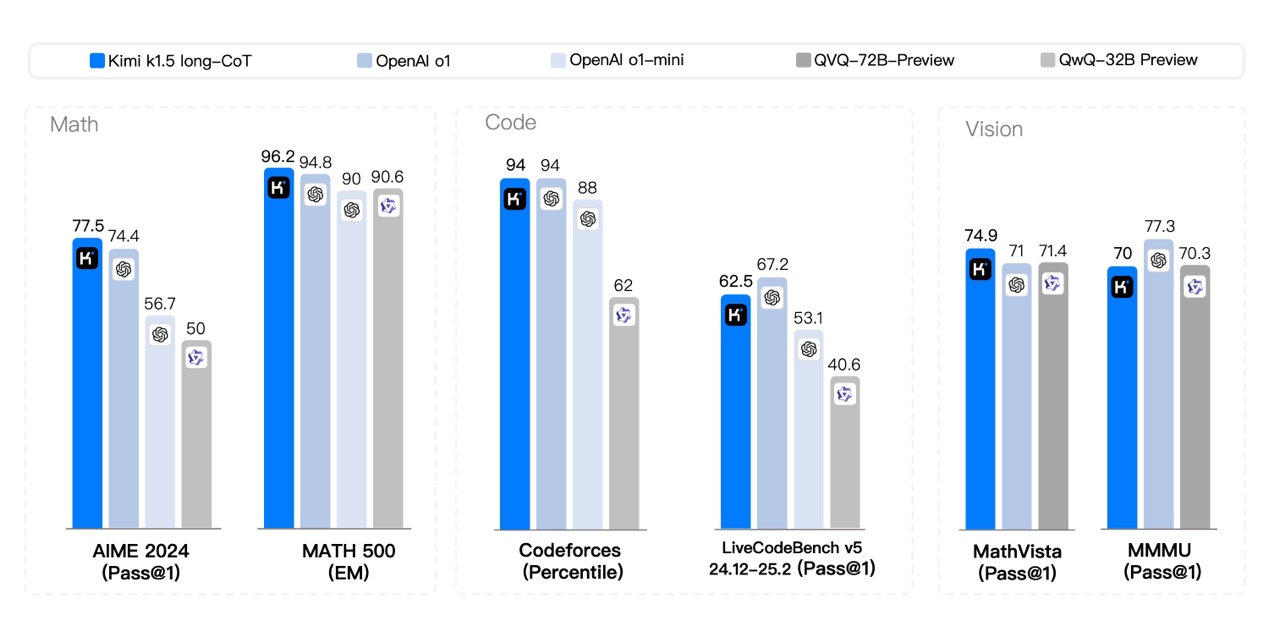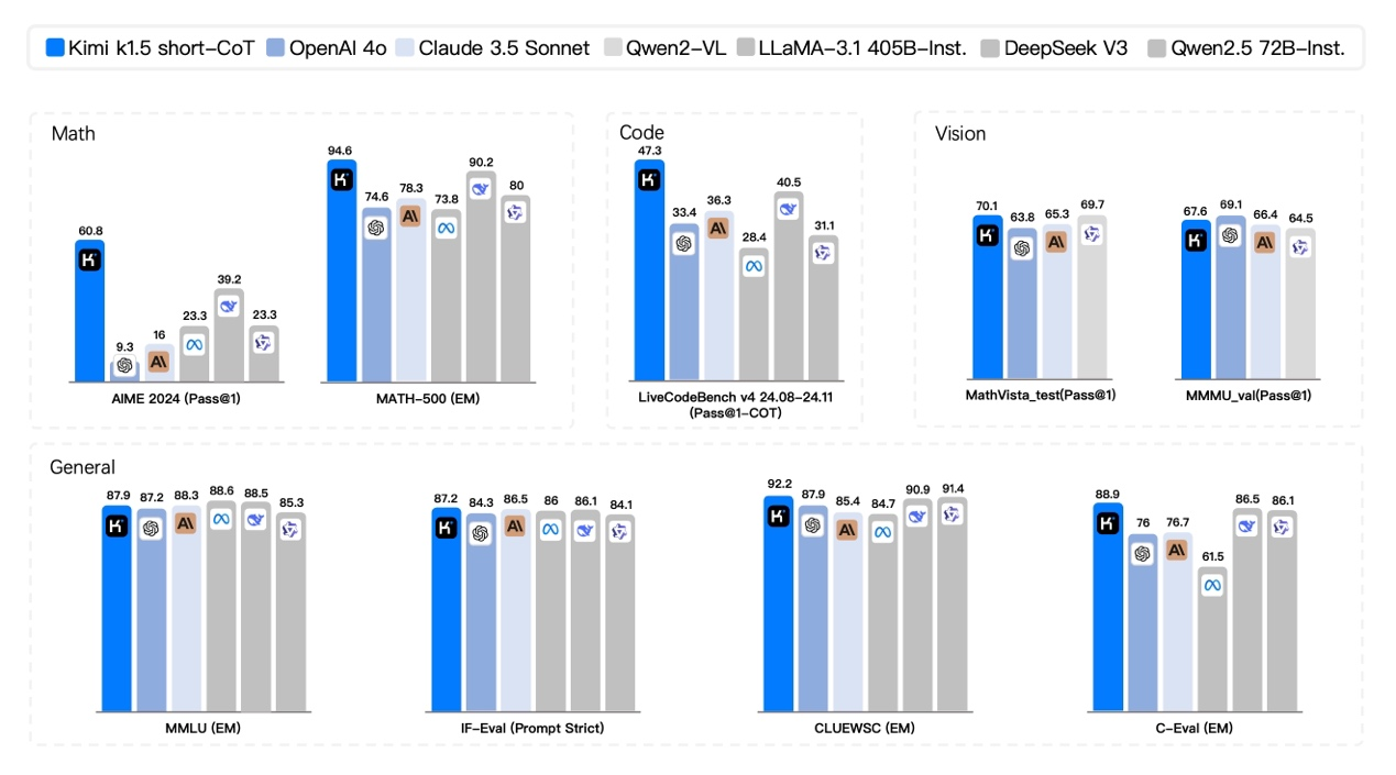 利用长短转化技术(long to short),以长链式思考技术改进短链式思考模型,在短链式推理性能测试中,k1.5模型在数学、代码等方面大幅超越GPT-4o、Claude Sonnet 3.5等全球领先模型,其中AIME 数学领先幅度达到550%。