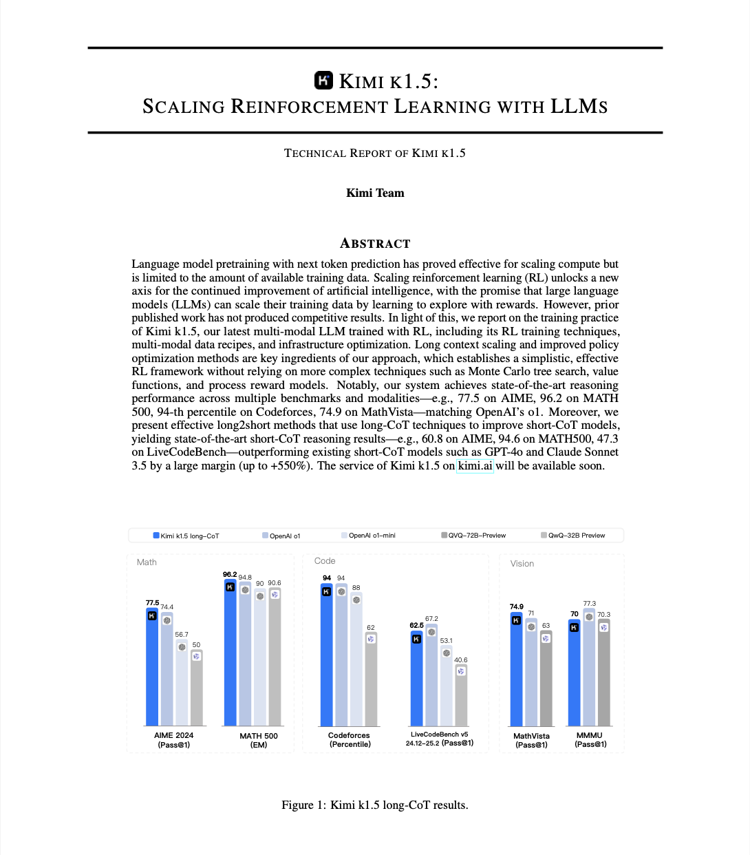 新模型发布的同时,月之暗面还首次对外公布了多模态模型技术训练报告《Kimi k1.5:借助大语言模型实现强化学习的 Scaling》,涵盖强化学习训练、多模态数据配方及基础设施优化等技术细节。报告指出,长文本处理能力扩展和改进策略的优化方法是本次技术迭代的关键要素,通过建立一个简单而有效的强化框架,无需依赖蒙特卡洛树搜索、价值函数、过程奖励模型等更复杂的技术,用最少的Token(数据或文本基本单元)就能高效完成任务,使模型能在多个基准测试和模态表现中达到最优水平。该报告的发布,将助力人工智能企业提升多模态大模型训练效率,进一步降低训练成本,为人工智能技术的应用实践提供重要参考。