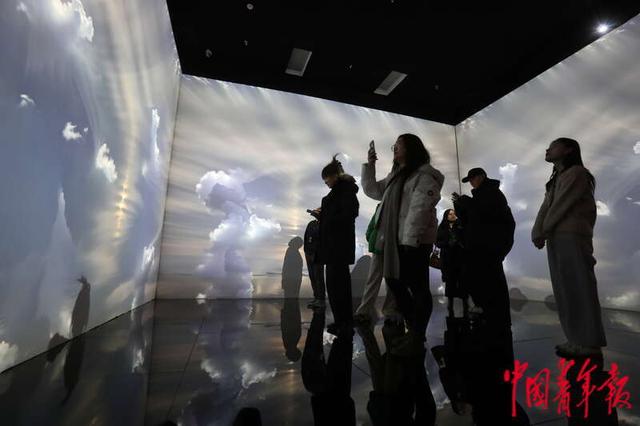 1月21日,北京泰康美术馆,参观者在“跨越六十年:人工智能的创意之火”展览现场的沉浸式空间体验AI艺术之美。中青报·中青网记者 孔斯琪/摄