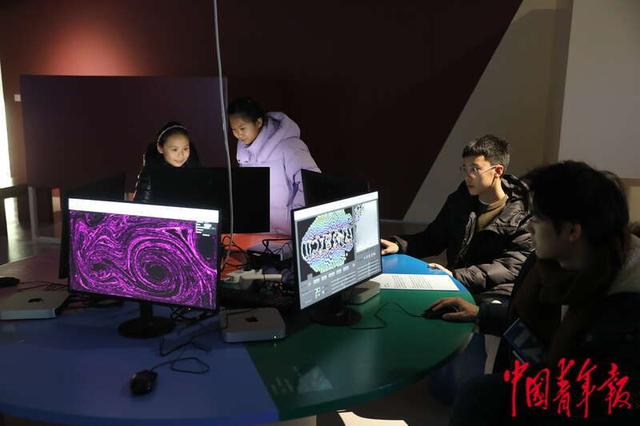 1月21日,北京泰康美术馆,“跨越六十年:人工智能的创意之火”展览现场,年轻人们在体验基于英国数学家约翰·霍顿·康威在1970年发明的“生命游戏”开发的互动软件。“生命游戏”通过简单的规则模拟生命在一个二维的无限网格上的演化过程,在游戏进行中,杂乱无序的细胞会逐渐演化出各种精致、有形的结构。中青报·中青网记者 孔斯琪/摄