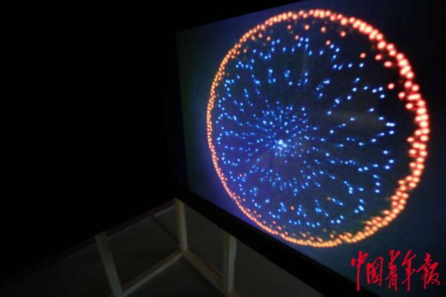 1月21日,北京泰康美术馆,“跨越六十年:人工智能的创意之火”展览现场,美国动画师约翰·惠特尼一世的作品《排列置换》。这部时长8分钟、用数字计算机制作的影片创作于1968年,展示了“点” 在复杂模式中的动态交互,令人联想到音乐的和声。中青报·中青网记者 孔斯琪/摄