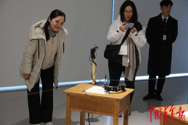 1月21日,北京泰康美术馆,参观者在“跨越六十年:人工智能的创意之火”展览现场观看正在通过低像素摄像头进行“写生”的机器人。中青报·中青网记者 孔斯琪/摄