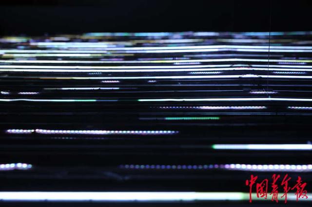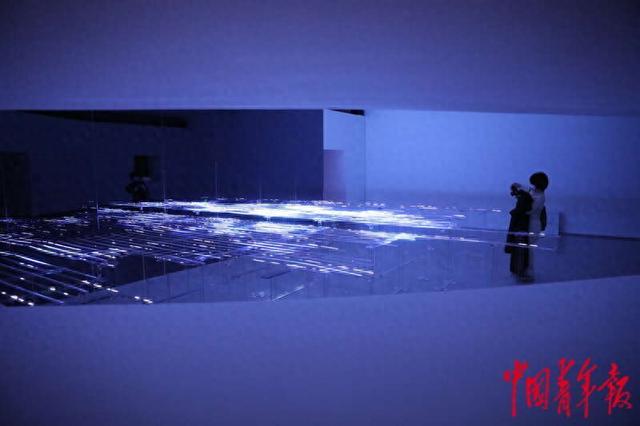 1月21日,北京泰康美术馆,参观者在“跨越六十年:人工智能的创意之火”展览现场观看中国艺术家刘佳玉的作品《激流引力》。这件装置作品由221条发光二极管有机玻璃组成,上面不同层次的光影是某处海平面风速等数据通过人工智能技术在虚拟世界中的“重建”。该展览展出了包括互动装置、VR游戏艺术体验、视频和声音装置等类型的全球30组艺术家作品,回顾人工智能艺术的发展历程、探讨人工智能是否能像人类一样有创造力等话题。中青报·中青网记者 孔斯琪/摄