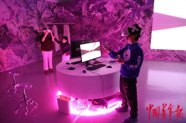 1月21日,北京泰康美术馆,一名小朋友在“跨越六十年:人工智能的创意之火”展览现场体验VR视觉游戏。中青报·中青网记者 孔斯琪/摄