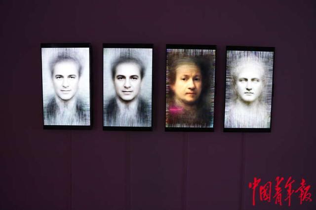 1月21日,北京泰康美术馆,“跨越六十年:人工智能的创意之火”展览现场,神经学家及认知神经科学家帕拉什凯夫·纳切夫的作品《规范肖像》。创作者通过训练一个自我组织的数学实体,从成千上万的真实细节中提炼形象,为历史上著名的哲学家绘制最接近普遍性的“画像”。中青报·中青网记者 孔斯琪/摄
