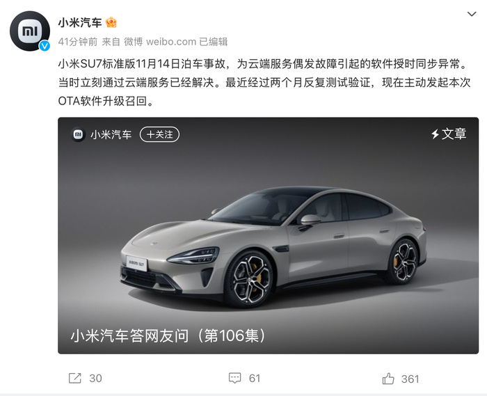 去年11月,多位车主反馈,在11月14日至15日两天时间里,他们小米SU7的均出现自动泊车功能故障,导致车身不同程度的受损。官方彼时表示,这是由于系统故障所致。