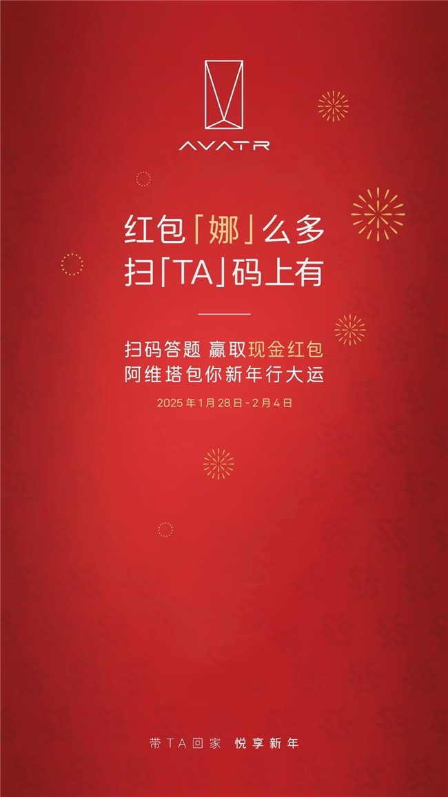 2025年1月28日,阿维塔科技宣布,即日起至2月4日春节期间,将推出超多福利活动与用户同贺新春。除了狂撒40万现金红包,阿维塔科技总裁还将在微博开启每日抽奖,最高49999元购车抵用券,以及高阶智驾包、保养服务套餐等超多奖品“壕”气发放,与用户一起红火过新年!