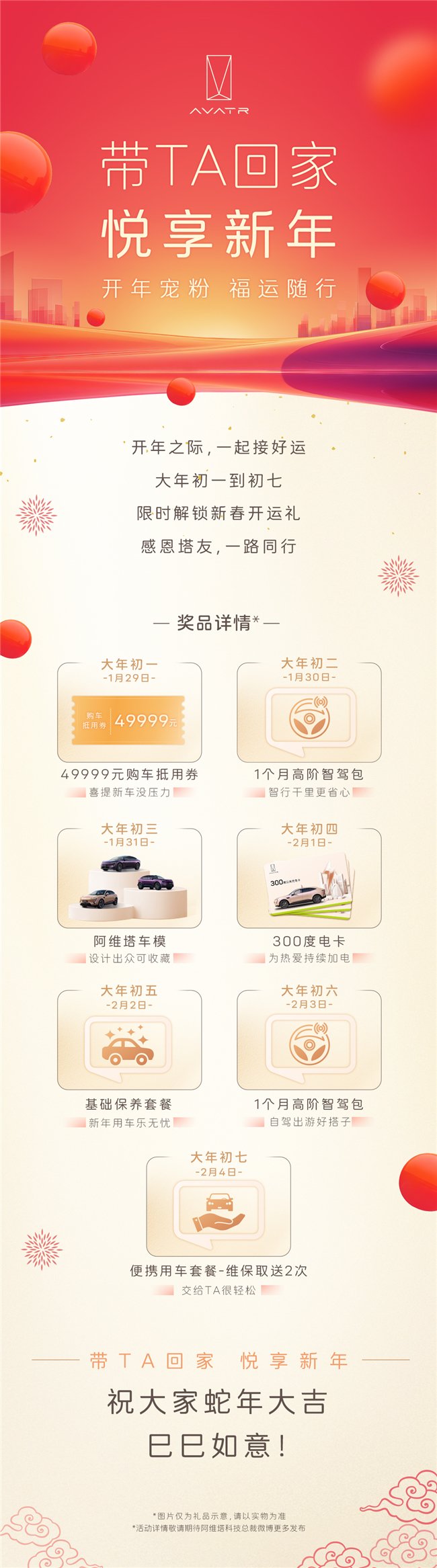 万家灯火辞旧岁,灵蛇献瑞迎新春。除夕到初七,阿维塔连续8天花式狂欢,用满满的诚意和丰厚的福利,回馈广大用户和粉丝的支持与信赖。蛇年新春红火开局,就从赢取阿维塔丰厚大奖开启吧!