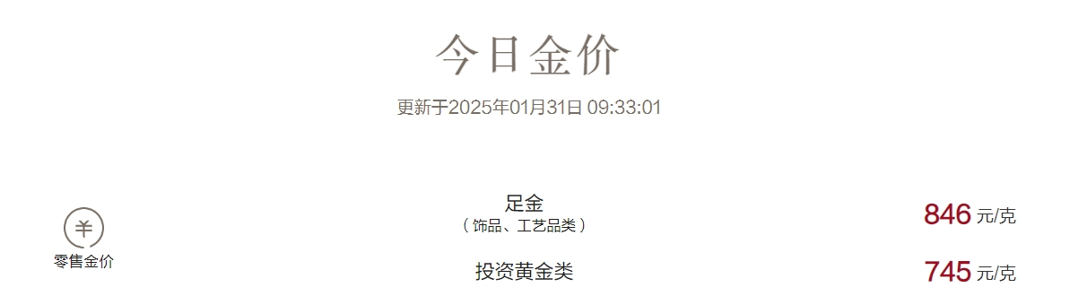 1月30日,国际金价大幅上涨。截至1月31日10时,现货黄金最高涨至2799.86美元/盎司,刷新历史高位;COMEX黄金期货最高涨至2859.5美元/盎司,刷新历史高位。31日,国内多家金店足金首饰价格已达846元/克。