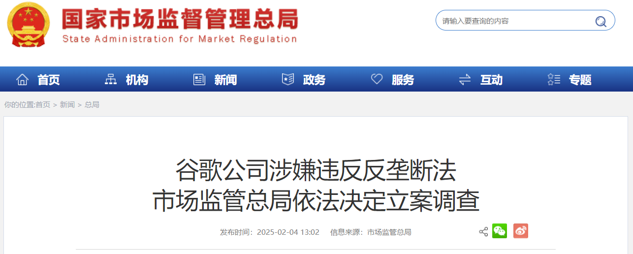 因谷歌公司涉嫌违反《中华人民共和国反垄断法》,市场监管总局依法对谷歌公司开展立案调查。