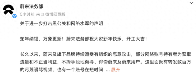【环球网科技综合报道】2月5日消息,蔚来法务部发布《关于进一步打击黑公关和网络水军的声明》,对外公布了近期在打击网络侵权行为方面的维权进展。蔚来法务部表示,已对多个侵权账号持有人提起诉讼,并将继续采取法律措施维护公司及子品牌乐道的合法权益。