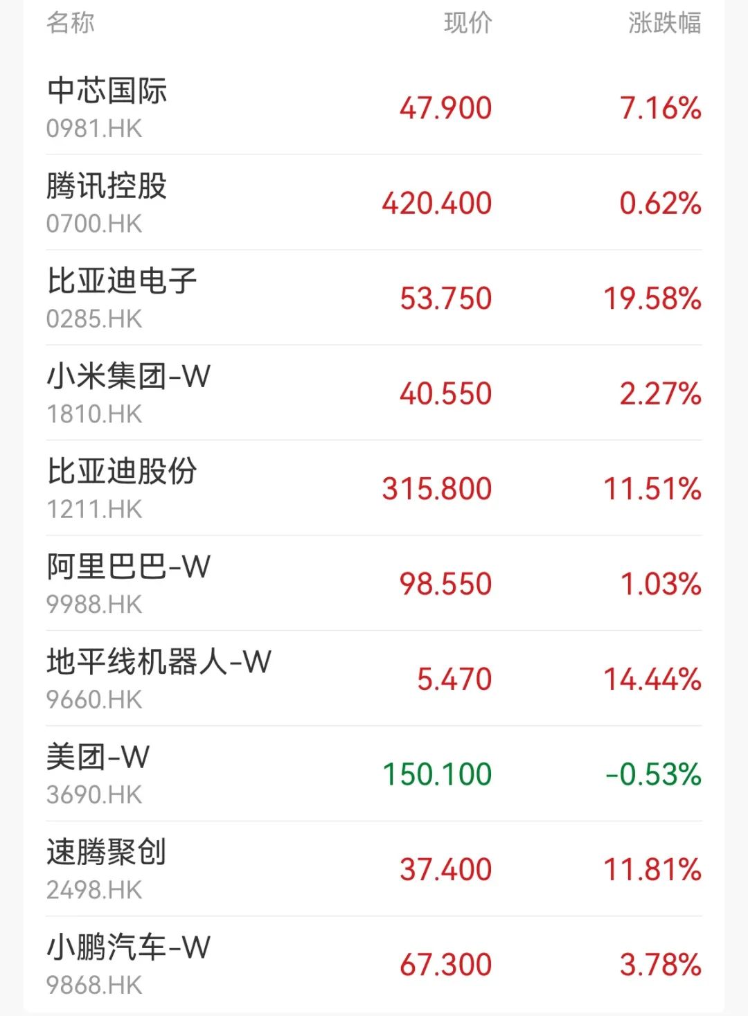 盘面上,科技股涨跌不一,小米涨超2%,百度跌超2%,美团跌超1%;比亚迪系列个股集体飙升,比亚迪电子午后大涨,收涨逾19%;苹果概念股涨幅居前,舜宇光学科技涨近10%;半导体概念股涨势强劲,华虹半导体、中芯国际均涨超7%;汽车、生物技术、中资券商等板块纷纷上涨。
