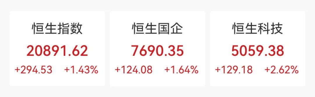 2月6日,港股三大指数震荡走高。截至收盘,恒生指数涨1.43%,报20891.62点;恒生科技指数涨2.62%,报5059.38点;恒生国企指数涨1.64%,报7690.35点。
