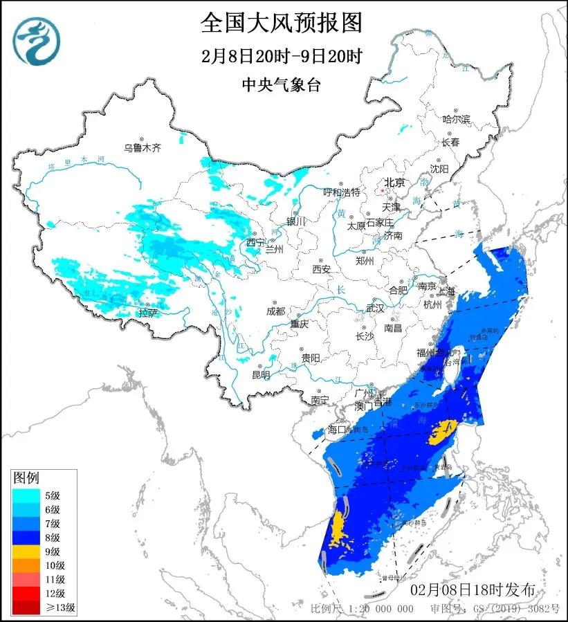 ■ 中央气象台8日18时发布大风蓝色预警:8日20时至9日20时,西藏中部、青海南部和东北部、甘肃西北部等地的部分地区有5~6级、阵风7~8级大风;东海大部海域、台湾海峡、台湾以东洋面、巴士海峡、南海大部海域有7~8级、阵风9级的大风。