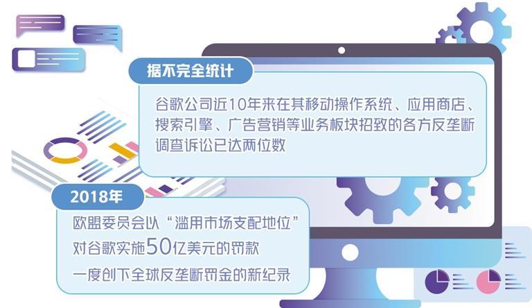 2018年,印度竞争委员会因谷歌在搜索引擎算法中掺加了“偏见和滥用市场主导”因素,对其罚款2100万美元。同年,欧盟委员会在开展了历时近3年的反垄断调查后,再度以“滥用市场支配地位”为由对谷歌实施50亿美元的罚款,一度创下全球反垄断罚金的新纪录。2022年俄乌冲突爆发后,谷歌旗下的视频平台“优兔”(YouTube)在政治考量驱使下,以“相关媒体违反了制裁和贸易规则”为由,封杀了多个俄罗斯媒体的频道及账号,随后“不出意外”地遭到俄反垄断机构的调查与处罚。就在今年的1月22日,印尼反垄断监管机构对谷歌公司处以2025亿印尼盾(约合8970万元)的罚款。理由是谷歌滥用其在Play商店支付结算系统中的主导地位,强制要求印尼应用开发商使用其Google Play计费系统,否则将下架相关应用。1月23日,英国方面宣布,将对谷歌的移动生态系统展开调查,重点关注谷歌在操作系统、应用商店和智能手机浏览器等领域的市场地位。甚至美国本土的市场监管机构也担忧谷歌的垄断行为可能导致消费者无法公平选择服务,进而导致市场秩序混乱。