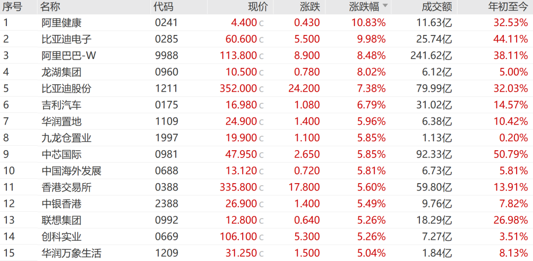 科技股涨幅居前,“阿里系”及“比亚迪系”表现强势。阿里健康涨10.83%,比亚迪电子涨9.98%,阿里巴巴涨8.48%,领涨蓝筹;今年以来,这三只股票分别上涨32.53%,44.11%和38.11%。