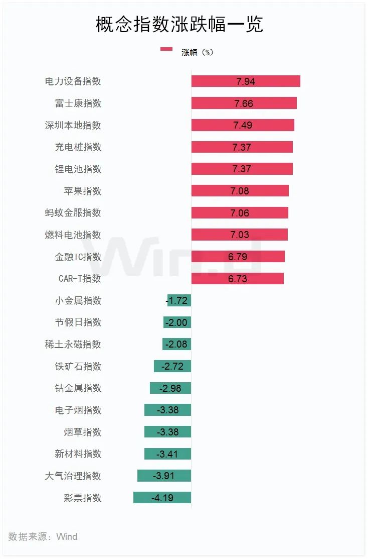从盘面来看,Wind概念板块多数上涨,电力设备指数涨7.94%,富士康指数涨7.66%,深圳本地指数涨7.49%。跌幅方面,彩票指数下跌4.19%,大气治理指数跌3.91%,新材料指数跌3.41%。