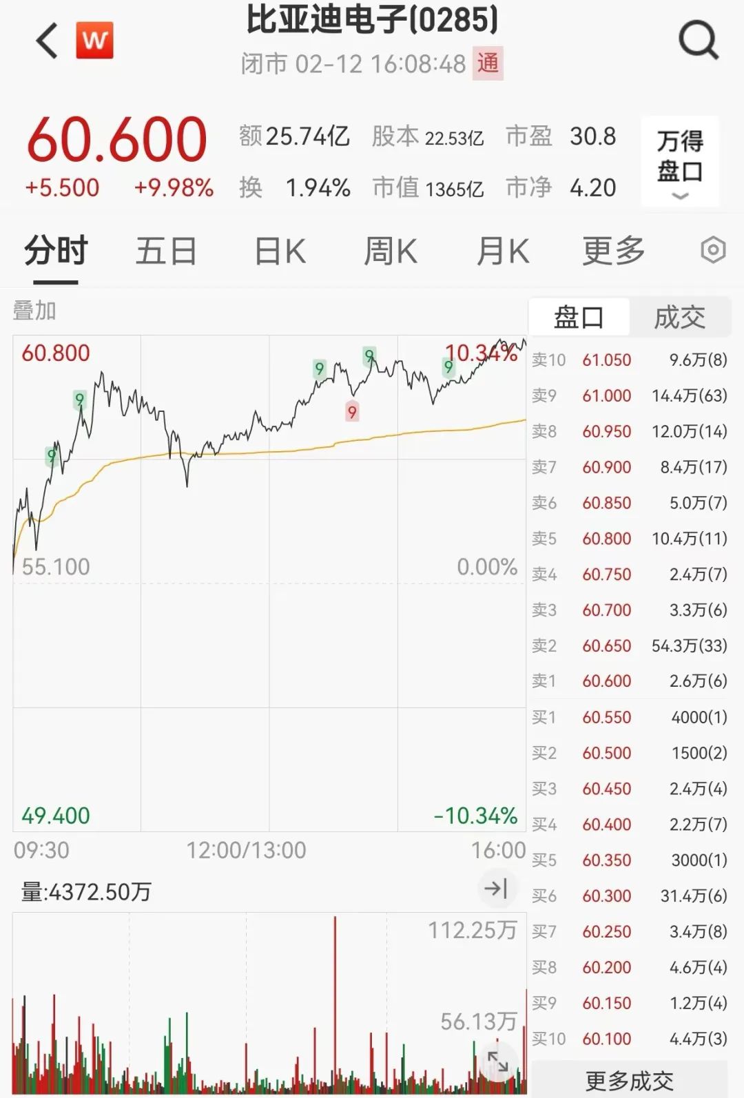 比亚迪智能化战略发布会超预期,“比亚迪系”表现强劲,比亚迪电子一度大涨10.34%,收于60.6港元/股,涨9.98%。