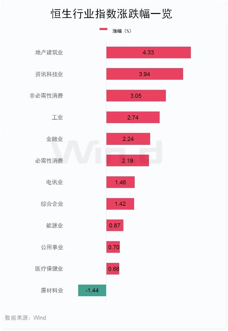 从行业表现看,恒生行业指数日内多数上涨,地产建筑业指数涨4.33%,资讯科技业指数涨3.94%,非必需性消费行业指数涨3.05%。跌幅方面,原材料业指数跌1.44%。