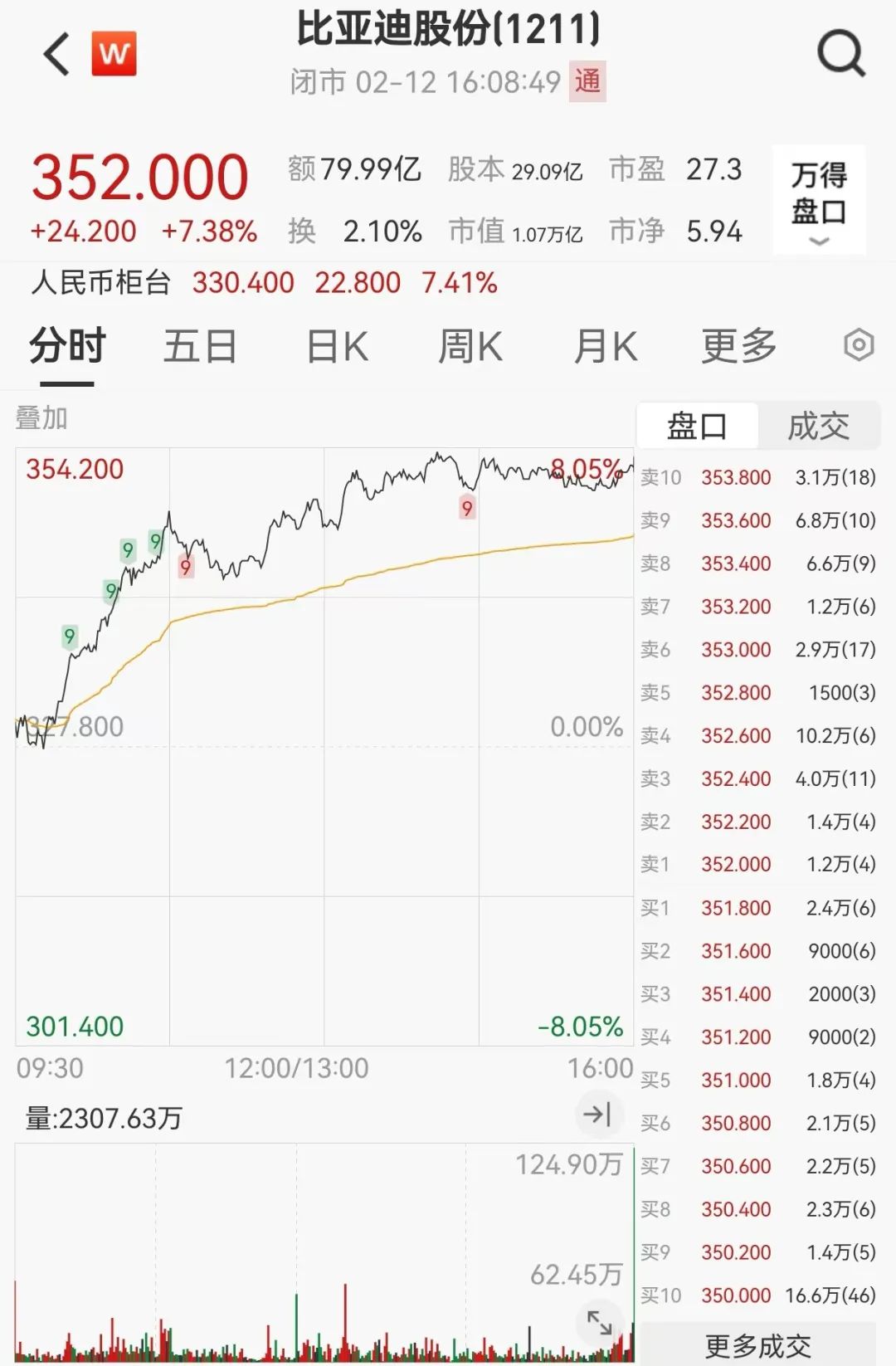 比亚迪股份一度大涨8.05%,报收352.00港元/股,涨7.38%。