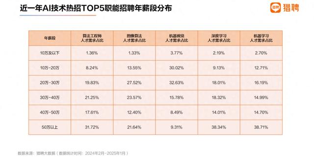 AI技术热招Top5职位招聘薪资分布,以下图片均来源于猎聘大数据研究院。