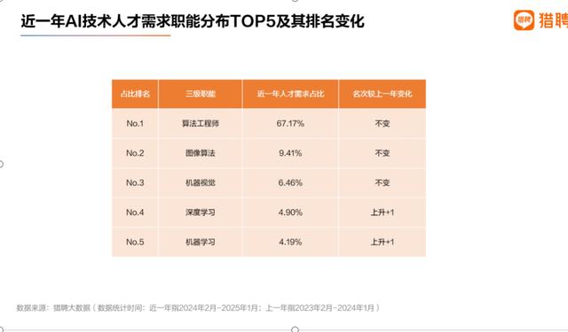 同道猎聘集团董事会主席兼首席执行官戴科彬告诉澎湃科技,猎聘平台数据显示,算法工程师等AI技术人才在市场中高度供不应求,这种紧缺状况不仅体现在招聘数量上,还体现在对人才质量的高要求上。