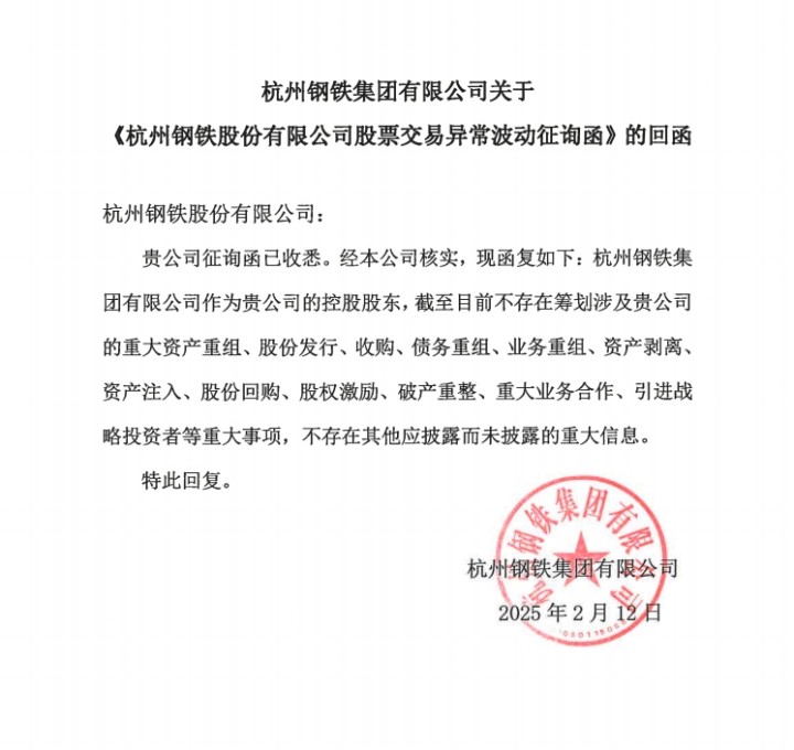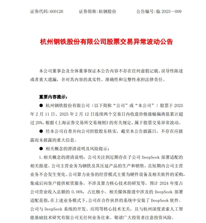 记者发现杭钢股份在2月11日和2月13日连续两次发布了股票交易异常波动公告,在最新一次的公告中,杭钢股份称,“公司关注到近期的相关报道。公司主营业务为钢铁及其压延产品的生产和销售,且短期内公司主营业务不会发生变化。公司算力业务的经营模式主要为硬件设备及相关软件的采购,集成后向客户提供租赁服务,不涉及算力核心技术的研发等,预计2024年度占公司营业收入总额的0.06%,占比极小。公司与媒体报道中涉及的相关公司无任何业务往来。敬请广大投资者注意投资风险。”