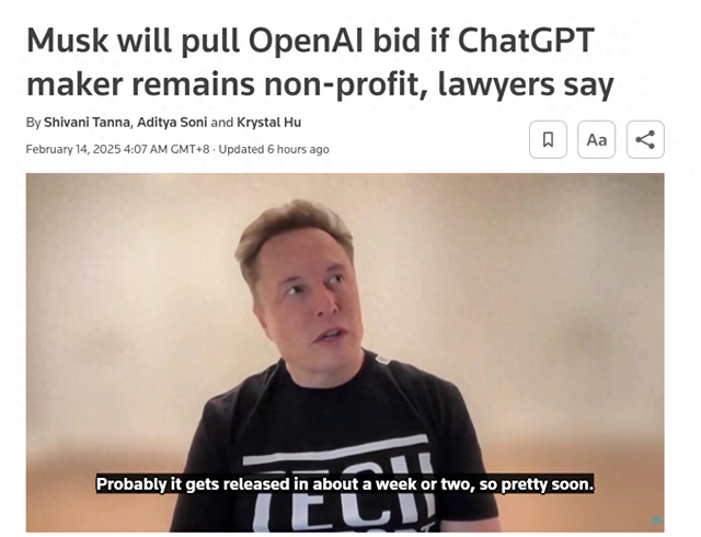 【环球网科技综合报道】2月14日消息,据路透社报道,由埃隆·马斯克(Elon Musk)领导的投资财团表示,如果OpenAI放弃将其非营利部门转型为营利性实体的计划,他们将撤回对OpenAI非营利部门的974亿美元收购提议。