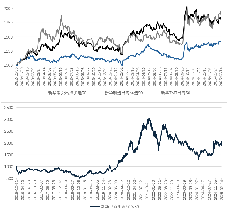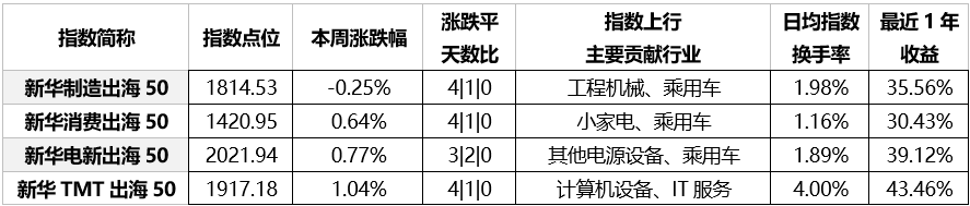 从整体盘面来看,本周新华出海系列指数多数收涨,TMT出海、电新出海、消费出海均收获1%左右涨幅。比亚迪、上海电气等权重股强势托举电新出海;TMT领域继续多点开花,万达电影、鼎捷数智、博彦科技周内涨20%,汉得信息涨超10%。
