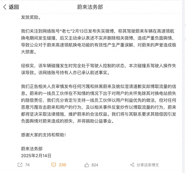【环球网科技综合报道】2月14日晚间,蔚来法务部发文称,关注到网络账号“老七”2月13日发布失实微博,称其驾驶蔚来车辆在高速领航换电期间发生碰撞,后又主动承认表述不实并删除相关微博,造成严重负面舆情,导致公众对于蔚来高速领航换电功能的有效性产生严重误解,对蔚来的声誉造成极大损害。