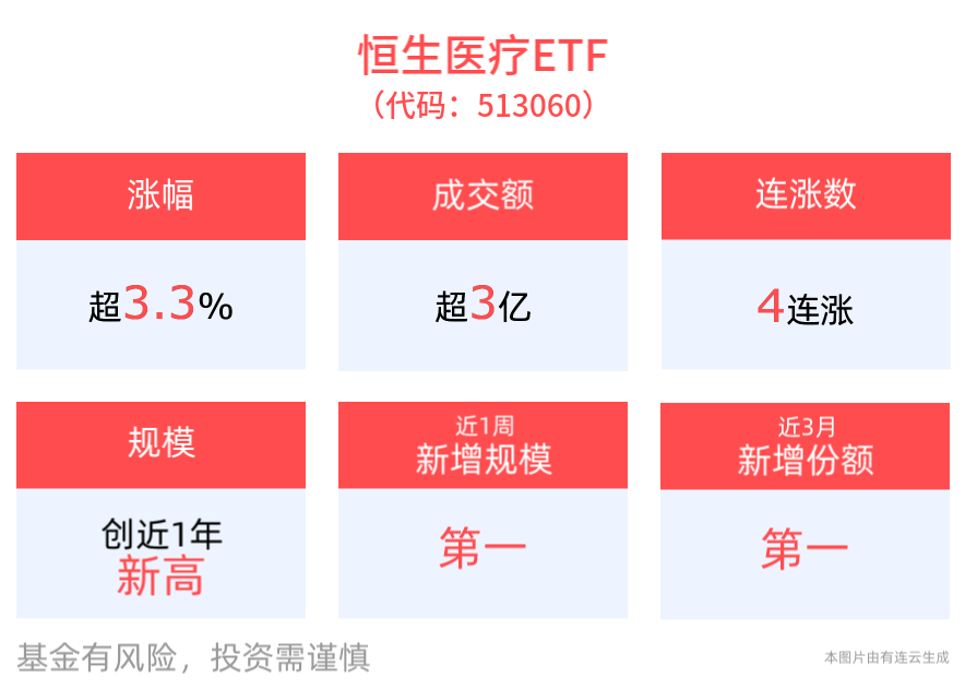 份额方面,恒生医疗ETF近3月份额增长18.00亿份,实现显著增长,新增份额位居可比基金1/3。