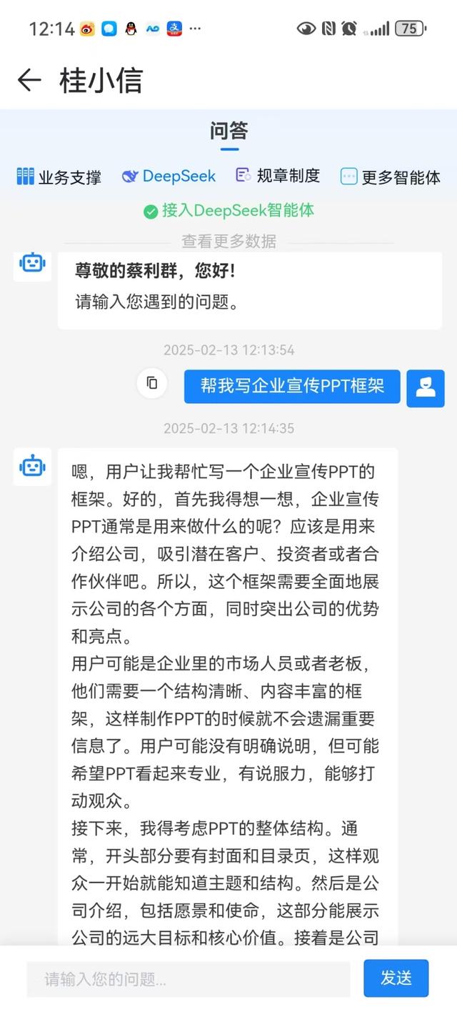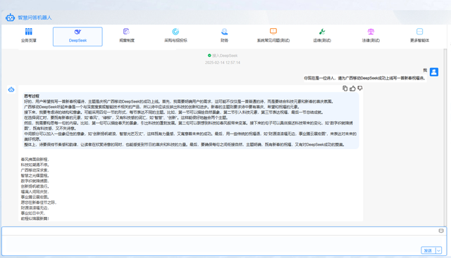 今年春节前夕,广西移动通过AI技术团队协同,成功完成DeepSeek大语言模型的本地化部署,新底座实现DeepSeek、九天、通义千问等多个模型的融合,完成“桂小信”智能问答助手的升级迭代。升级后的“桂小信”在知识管理方面表现出色,能够快速整合与分析公司内部海量知识,方便员工快速获取所需信息,促进知识的流通与共享。同时,在创新发展方面,DeepSeek通过对大量数据的分析,挖掘潜在的业务机会与创新点,为公司的业务拓展和产品创新提供有力的数据支持。广西移动还通过“桂小信”为职工提供从业务支撑、规章制度、财务、采购等模块的专业级知识服务,进一步提升工作效率。