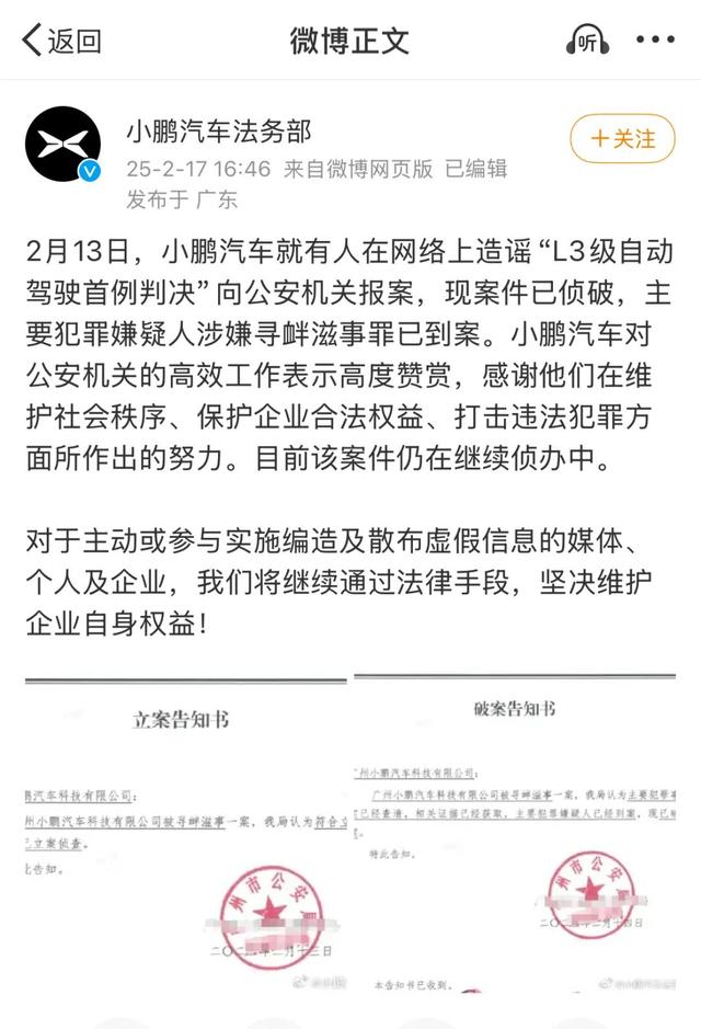 2月12日下午,小鹏汽车法务部对该文进行辟谣,表示文中描述的车辆碰撞事故、诉讼及法院判决纯属捏造。并且,已对该账号发布的全部不实内容完成取证,并将依法追究造谣者和传播不实信息者的法律责任。