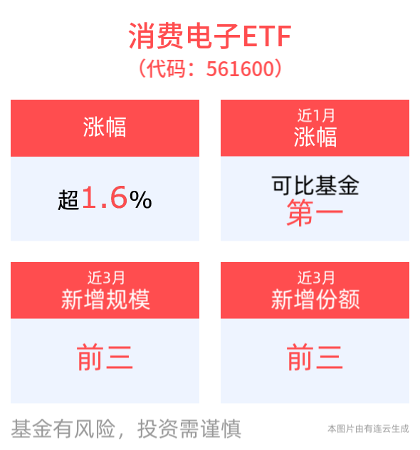 份额方面,消费电子ETF近3月份额增长2200.00万份,实现显著增长,新增份额位居可比基金3/7。