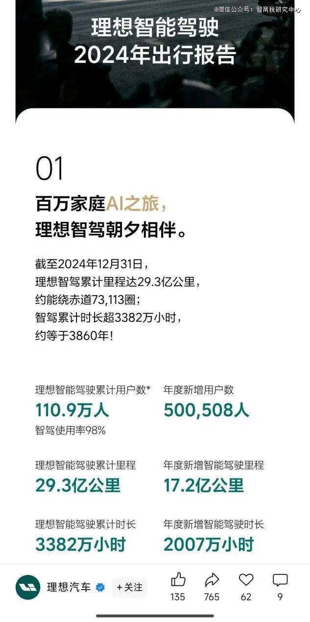 理想智能驾驶2024年出行报告显示:截至2024年底,理想智驾累计里程29.3亿公里,智驾累计时长3382万小时,智驾累计用户数110.9万人。