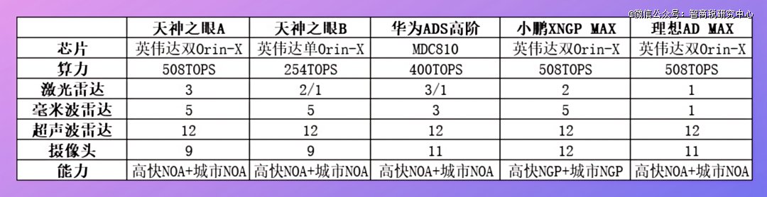 为了更直观地看出,各家厂商智驾技术、参数上的优劣,潘哥选取一些主流厂商,将它们的顶配智驾系统,与比亚迪进行了一番比对: