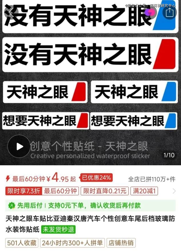 为了避免被别人嘲笑,一些车主在拼多多等电商平台,购买对应的天神之眼车标,用阿Q的精神胜利法安慰自己。