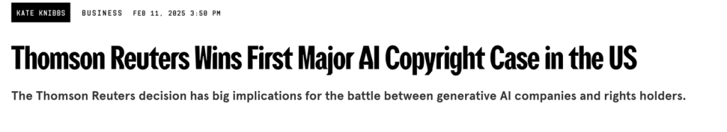 而AI在生成内容时,未经授权使用他人作品进行训练,已经出现过实际的侵权案例。例如,Thomson Reuters在与Ross Intelligence的诉讼中,法院裁定Ross未经授权复制其内容用于AI训练,侵犯了其版权。