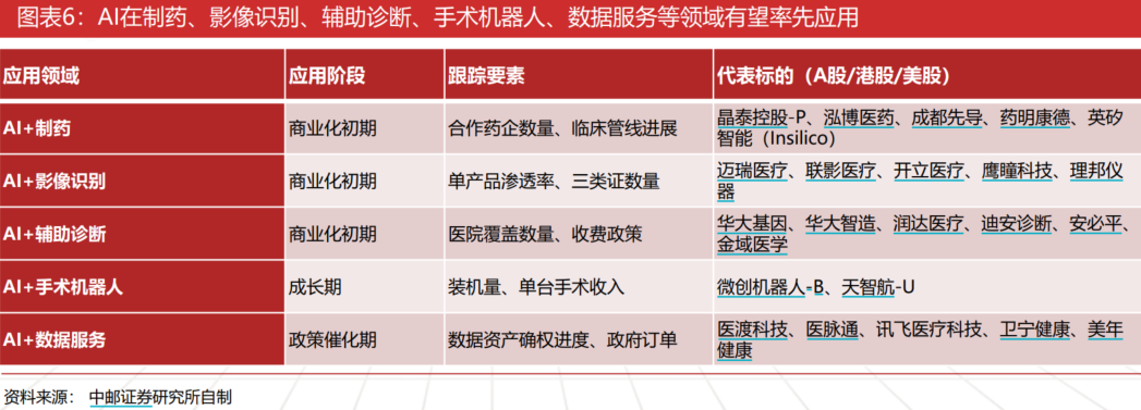 医疗行业大模型快速发展,主要在以下四个大方向演绎:1)AI+制药:凭借AI强大的数据分析和模型预测能力,AI制药在分子设计和药物筛选方面能够大幅提升药物的研发效率和成功率。2)AI+影像/手术:AI在医疗影像分析方向深度学习,能够快速识别病灶、精准诊断疾病并提供综合解决方案。3)AI+辅助诊断:基于庞大优质的数据积累优势,利用AI技术并结合专家训练,实现快速分析、诊断及解读。4)AI+医疗服务:主要面向医疗机构、政府部门及群众在数据信息化基础上,利用AI大模型优化诊疗服务和疾病管理。(来源:中邮证券20250217《中邮证券AI+医疗行业深度:AI+医药,势不可挡,未来已至》)