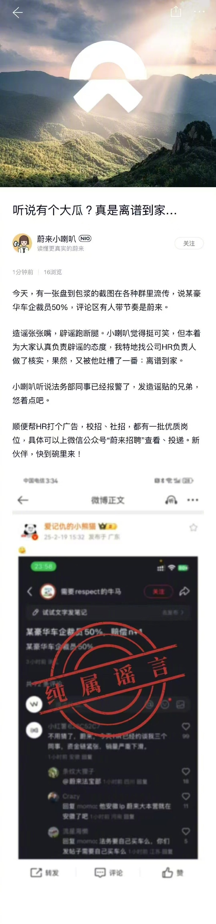 蔚来2月19日通过其官方账号“蔚来小喇叭”发文称,网传某豪华车企裁员50%,评论区有人带节奏是蔚来,“法务部同事已经报警了,发造谣帖的兄弟,悠着点吧”。