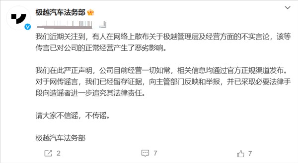无独有偶,极越汽车也在去年12月被谣言缠身。社交媒体上有人爆料称极越汽车计划裁员40%,还涉及高管离职、移民等传闻。极越汽车法务部立即辟谣,强调公司经营状况良好,所有重要信息仅通过官方渠道发布。对于这些谣言,极越汽车已留存证据并向主管部门举报,将依法追责造谣者。