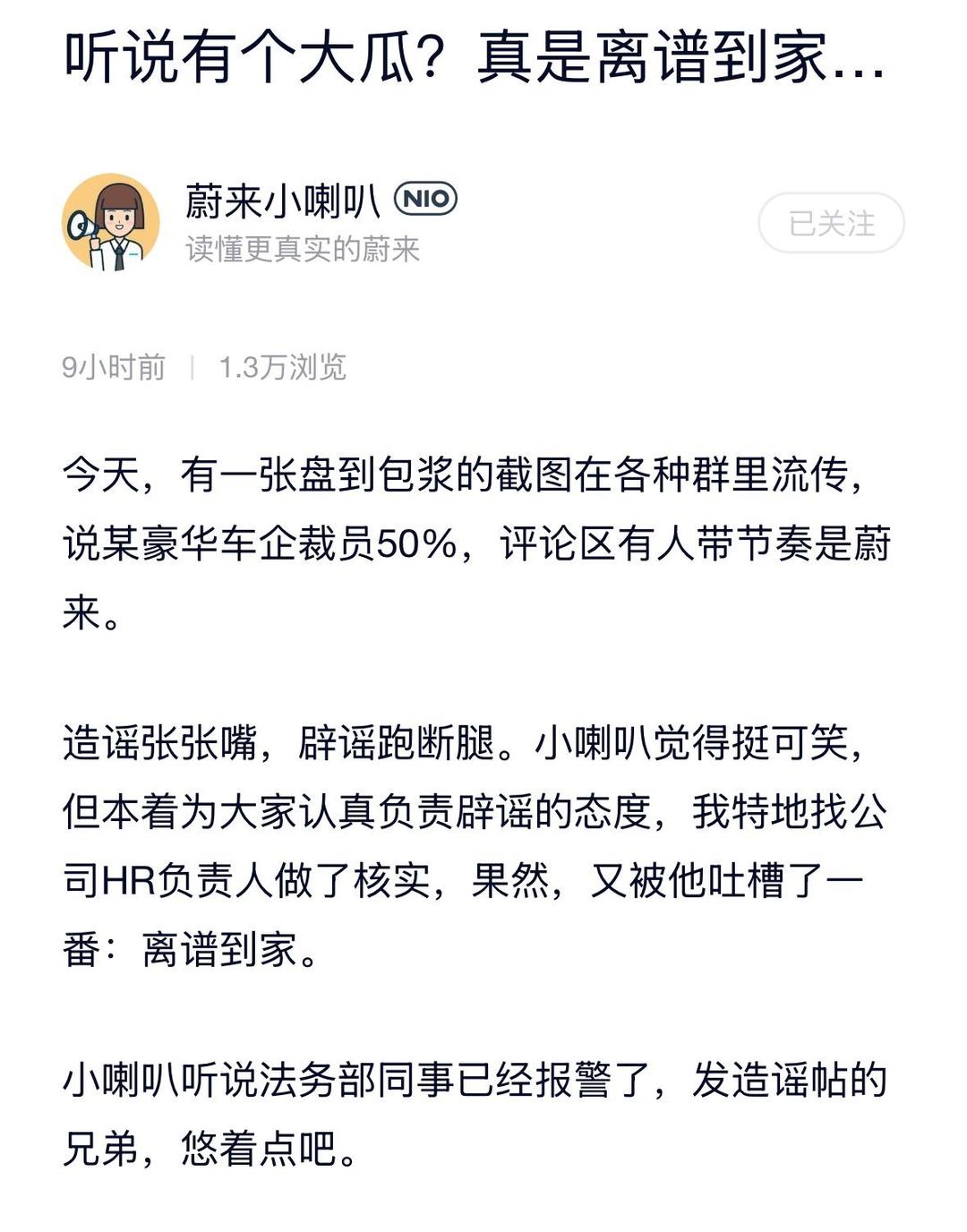 2月19日晚,蔚来通过官方账号“蔚来小喇叭”强硬辟谣,直斥裁员谣言“离谱到家”!蔚来法务部已报警处理,警告造谣者:“悠着点吧!”